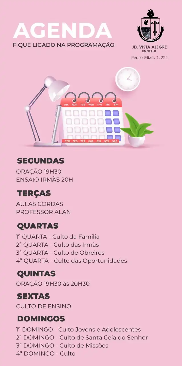 Folheto Agenda Semanal de Igreja Evangélica Tipo: FolhetoCliente: A.D Vista AlegreTema: Programação da semanaCores: Lilas, branco e pretoMensagem: Agenda Fique ligado na programação Segundas: Oração 19h30; Ensaio irmãs 20h;Terças: Aulas cordas; Professor Alan;Quartas: 1 quarta – culto da família; 2 quarta – culto das irmãs; 3 quarta – culto de obreiros; 4 quarta – culto … Ler mais Folheto Agenda Semanal de Igreja Evangélica