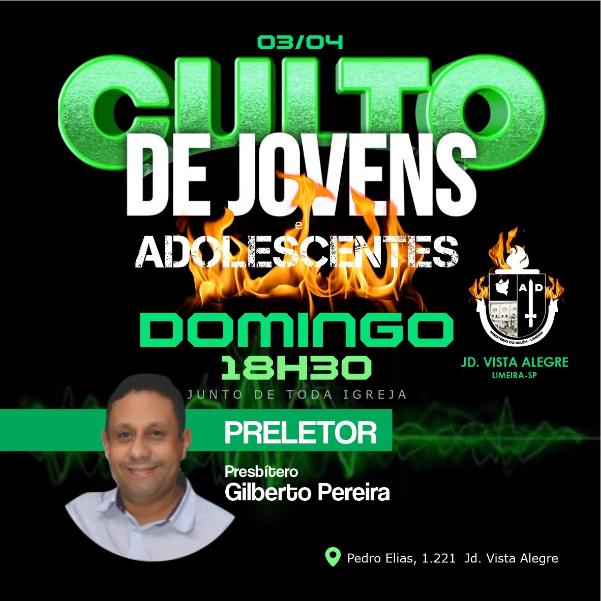 Propaganda Culto Jovens Tipo: Propaganda para Rede SocialCliente: Igreja Assembleia de Deus – Jd. Vista AlegreTema: Culto dos jovensCores: Verde, preto e brancoMensagem: Propaganda para igreja. 03/04 Culto de Jovens e AdolescentesDomingo 18h 30mJunto de toda a igreja.Preletor: Presbítero Gilberto PereiraAD – Vista AlegreRua Pedro Elias, 1.221 Jd. Vista Alegre
