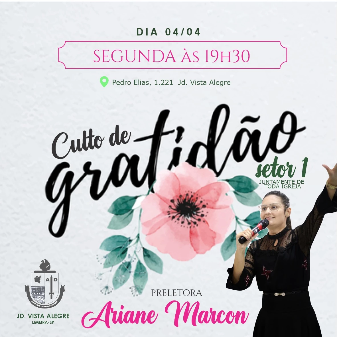 Propaganda Culto de Gratidão Tipo: Propaganda para Rede SocialCliente: Assembleia de Deus – Jd. Vista AlegreTema: Culto de gratidãoCores: Cinza, preto e rosaMensagem: Propaganda para igreja. Dia 04/04, Segunda as 19:30Rua Pedro Elias, 1.221 – Jd. Vista AlegreCulto de GratidãoSetor 1 Juntamente de toda a igrejaPreletora Ariane MarconAD – Jd. Vista Alegre – Limeira/SP