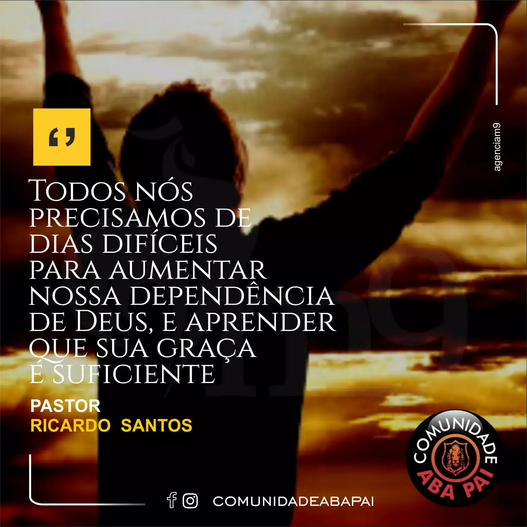 Propaganda Igreja Evangélica Dias Difíceis Dependência da Graça de Deus Tipo: Propaganda para InstagramSegmento: ReligiãoTema: Dias Difíceis e a Dependência da Graça de DeusCliente: Comunidade Aba PaiCores: Vermelho, amarelo e branco.Mensagem: “Todos nós precisamos de dias difíceis para aumentar nossa dependência de Deus, e aprender que sua graça é o suficiente.” Pastor Ricardo Santos