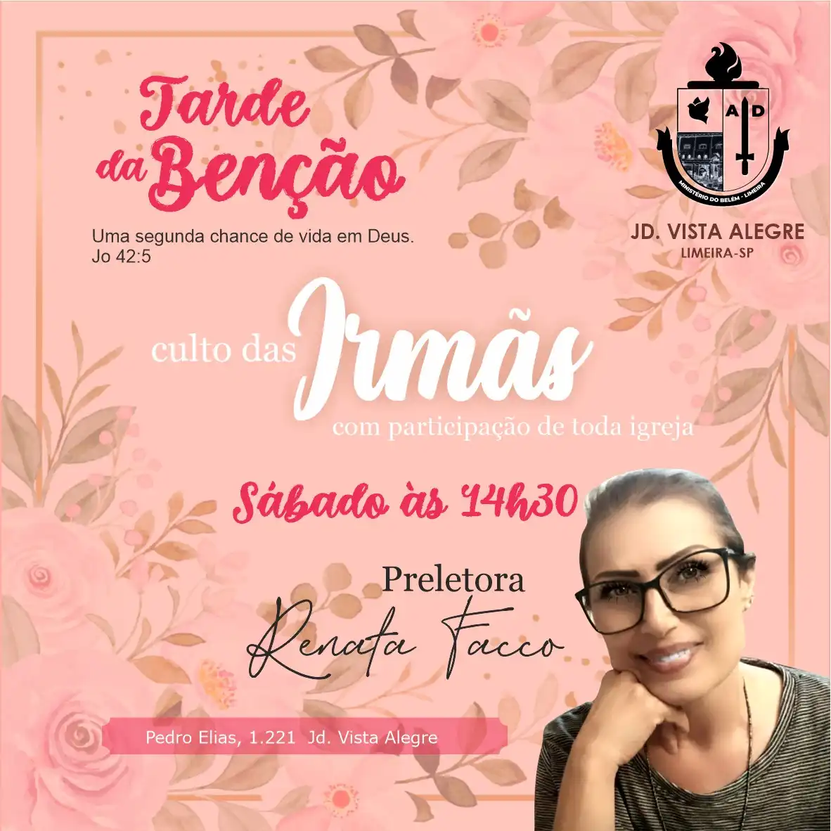 Propaganda de Post Culto das Irmãs Tarde da Benção Tipo: Propaganda para Rede SocialCliente: Assembleia de Deus – Jd. Vista Alegre – Limeira/SPTema: Culto das irmãsCores: Rosa e brancoMensagem: Propaganda para igreja. Tarde da benção. Uma segunda chance de vida em Deus. Jó 42:5.Culto das irmãs, com participação de toda igreja.Sábado as 14:30, com a … Ler mais Propaganda de Post Culto das Irmãs Tarde da Benção