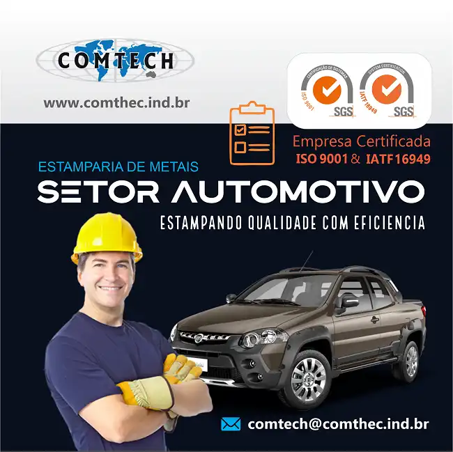 Propaganda Indústria de Estampos de Metais para Carros Tipo: Propaganda para Rede SocialCliente: Comtech Estampos de MetaisTema: Estampos de MetaisCores: Azul, preto e brancoMensagem: Propaganda, para indústria de estampos de metais no setor automotivo industrial; Estampando com qualidade; Contendo selo ISO 9001 e IATF 16949; Acesse o site: www.comtech.ind.br;