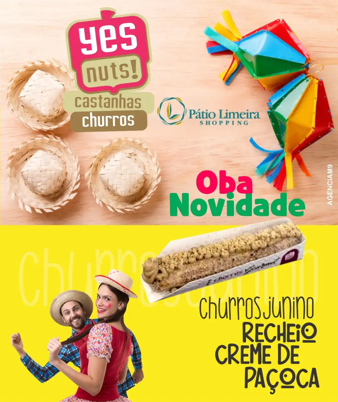 Propaganda Post Churros Recheio de Creme de Paçoca Tipo: Propaganda para Rede SocialCliente: Yes Nuts!Tema: ChurrosCores: Amarelo, verde e rosaMensagem: Oba novidade! Churros junino recheio creme de paçoca