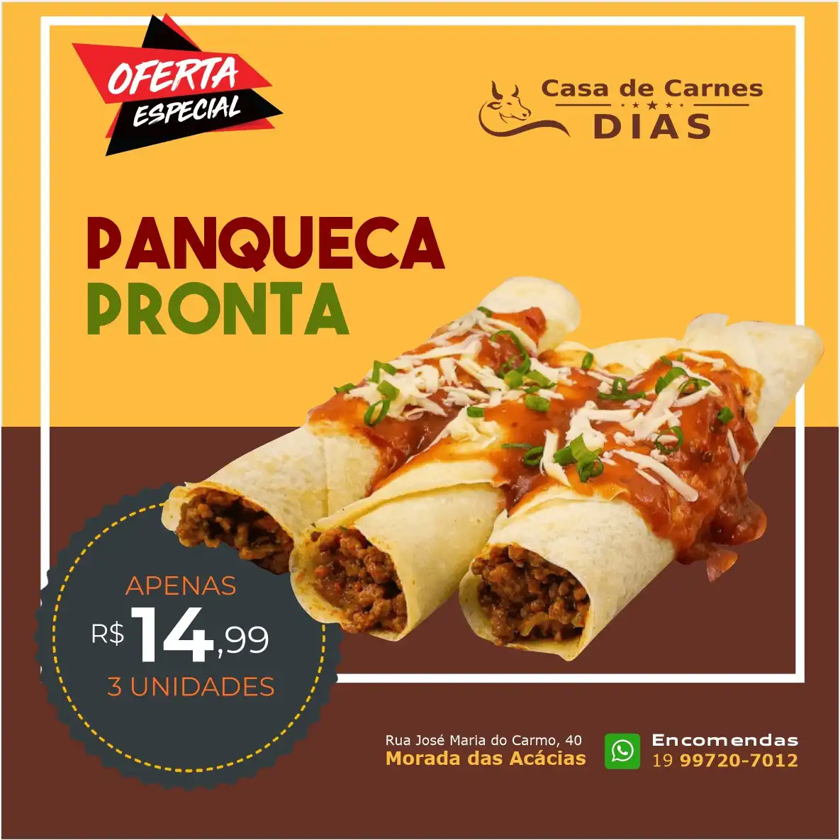 Propaganda Post Panqueca Pronta Tipo: Propaganda para Rede SocialCliente: Casa de Carnes DiasTema: PanquecaCores: Amarelo e marromMensagem: Oferta especial panqueca pronta apenas R$ 14,99, 3 unidades