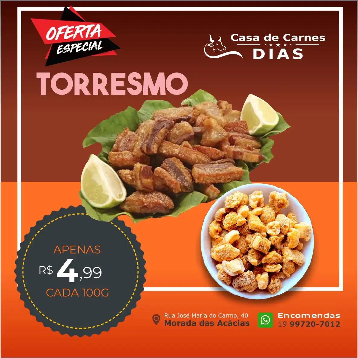 Propaganda Post Torresmo Promoção Tipo: Propaganda para Rede SocialCliente: Casa de Carnes DiasTema: TorresmoCores: Marrom e laranja.Mensagem: Oferta especial, torresmo, apenas R$4,99 cada 100g.