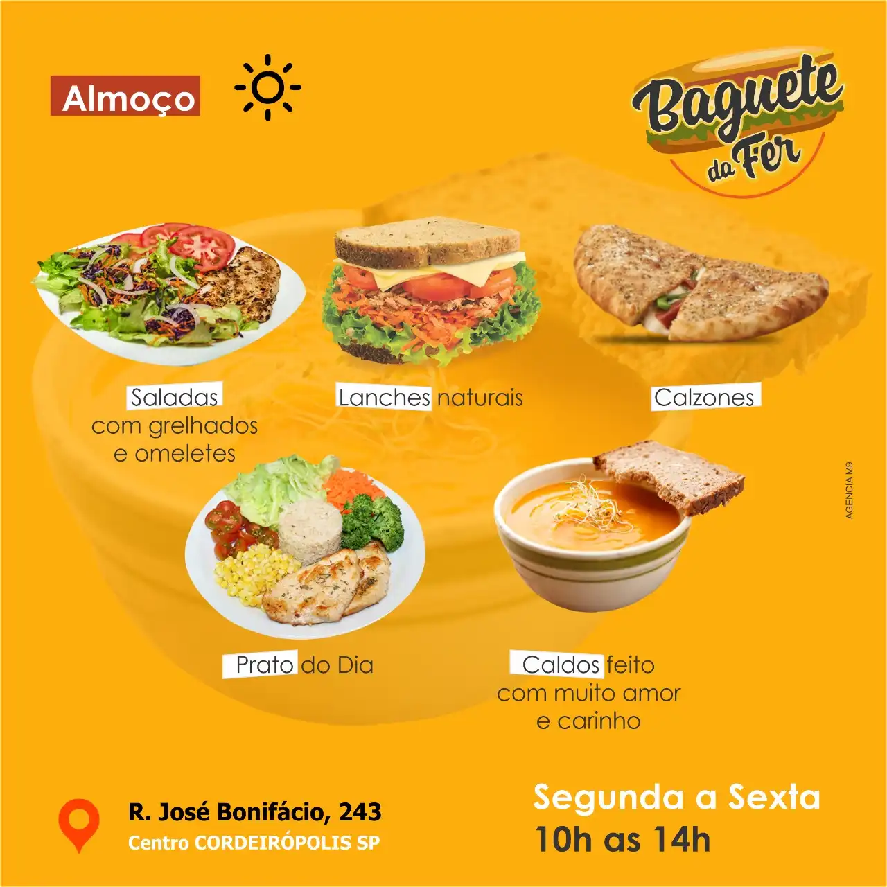 Propaganda Sopas e Caldos Tipo: Propaganda para Rede SocialCliente: Baguete da FerTema: Sopas e caldosCores: Amarelo e vermelhoMensagem: Almoço: saladas, lanches naturais, calzones, prato do dia e caldos.