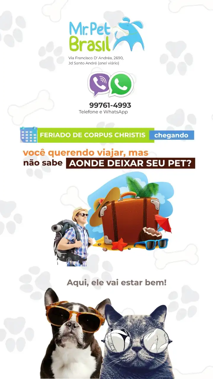 Folhet para Hotel Pet Tipo: Propaganda para Rede SocialCliente: Mr. Pet BrasilTema: Hospedagem de petCores: Azul, verde e roxoMensagem: Feriado de Corpus Christis chegando Você querendo viajar, mas não sabe onde deixar seu pet?Aqui, ele vai estar bem!