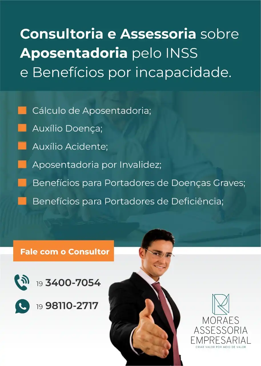 Folheto Assessoria e Consultoria para Aposentadoria Tipo: FolhetoCliente: Moraes Assessoria EmpresarialTema: AposentadoriaCores: Verde, branco e laranjaMensagem: Consultoria e assessoria sobre aposentadoria pelo INSS e benefícios por incapacidade. Cálculo de aposentadoria;Auxílio doença;Auxílio acidente;Aposentadoria por invalidez;Benefícios para portadores de doenças graves;Benefícios para portadores de deficiência;