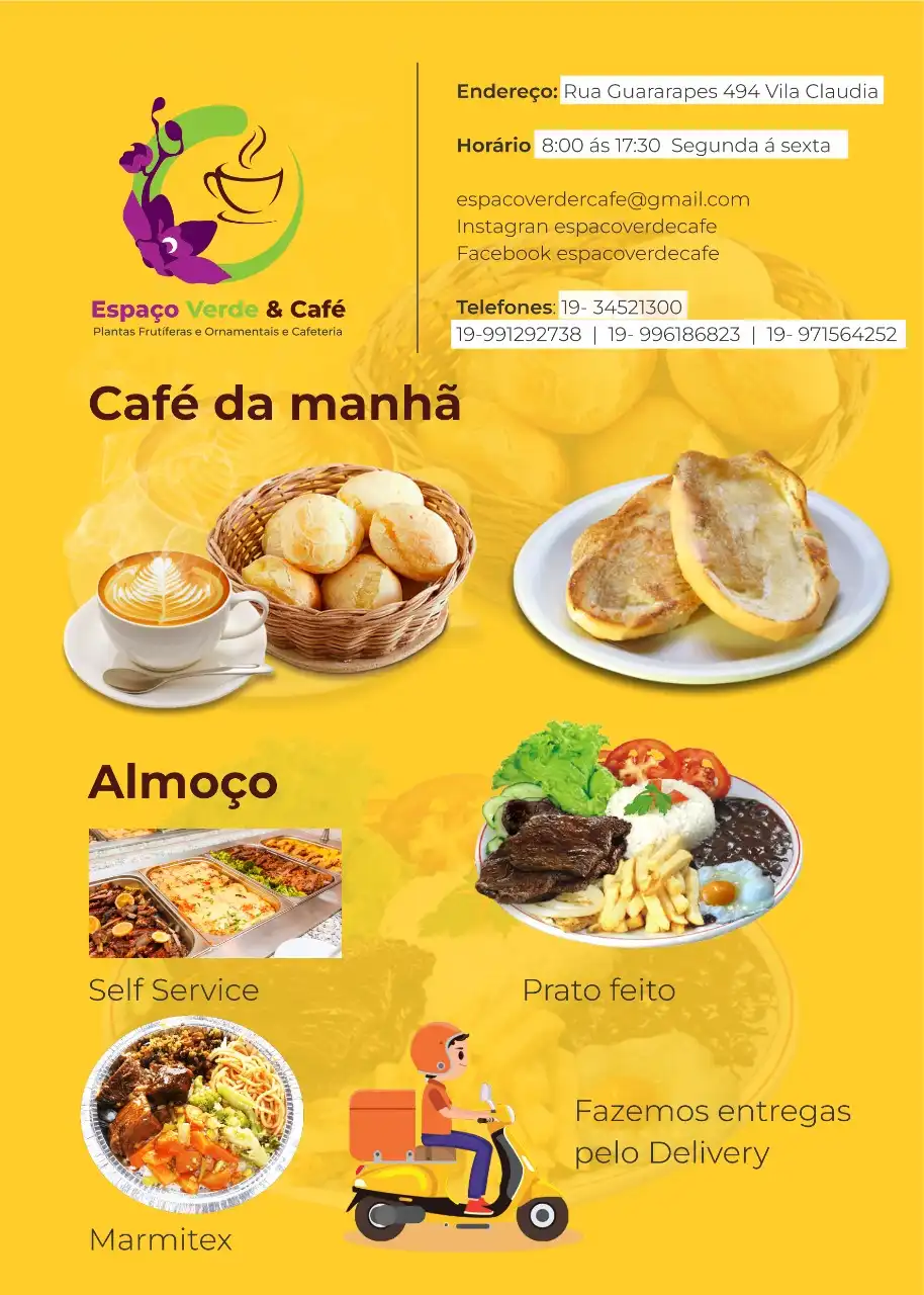 Folheto Café da Manhã e Almoço Padaria e Restaurante Tipo: FolhetoCliente: Espaço Verde & CaféTema: Padaria e restauranteCores: Amarelo, verde e lilásMensagem: Criação e desenvolvimento de folheto para padaria, restaurante