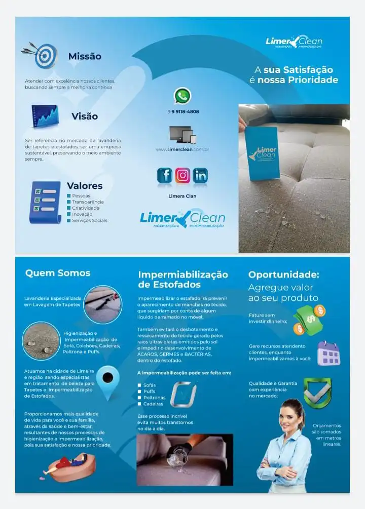Folheto Trifólio para Serviço de Himpermiabilização de Sofá Tipo: FolhetoCliente: Limer CleanTema: Himpermiabilização de sofáCores: Azul e brancoMensagem: A sua satisfação é nossa prioridade! Com os seguintes temas:Missão, visão, valores, quem somos, himpermiabilização de estofados.Oportunidade: Agregue valor ao seu produto.