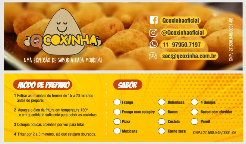 Embalagem para Salgados Congelados Tipo: Embalagem Formato: Horizontal Segmento: Salgados Congelados Cores: Tons Amarelo e Laranjas Cliente: QCoxinha Mensagem: Uma explosão de sabor a cada mordida! Modo de Preparo: 1 Retirar as coxinhas do freezer de 15 a 20 minutos antes do preparo; 2. Aqueça o óleo da fritura em temperatura de 180° e em … Ler mais Embalagem para Salgados Congelados