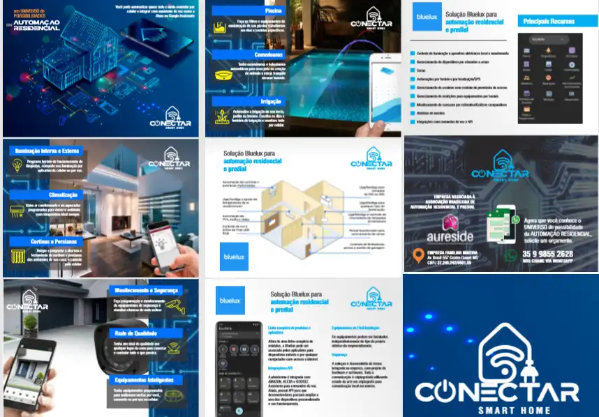Folheto Automação Residencial Tipo: Folheto Segmento: Automação Residencial Cores: Azul e Branco Cliente: Conectar Smart Home Mensagem: Automação Iluminação, Climatização, Cortinas e Persianas, Monitoramento e Segurança, Rede e Internet, Piscina, Comedouros, Irrigação, Jardim. Automação Residencial com total controle via Celular.
