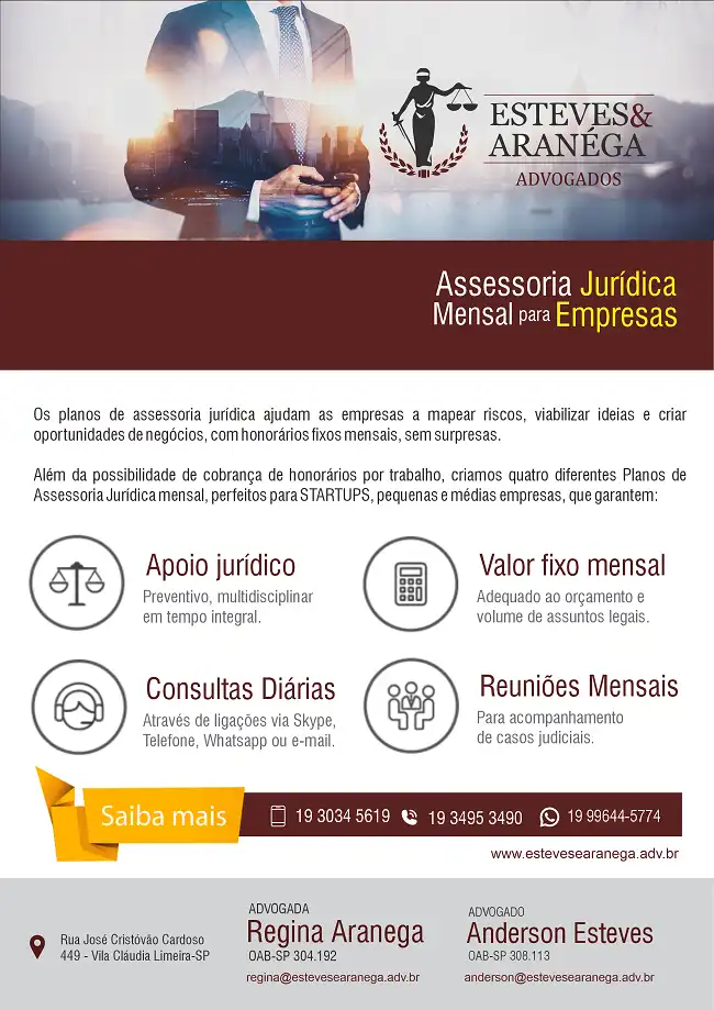 Propaganda Assessoria Juridica Empresas Mensal Tipo: Propaganda para Rede Social Segmento: Advocacia Tema: Assessoria Juridica Empresas Mensal Cores: Vinho, Cinza e Dourado Mensagem: Assessoria Jurídica Mensal para Empresas. Os planos de assessoria jurídica ajudam as empresas a mapear riscos, viabilizar ideias e criar oportunidades de negócios, com honorários fixos mensais, sem surpresas. Apoio Jurídico, Consultas … Ler mais Propaganda Assessoria Juridica Empresas Mensal