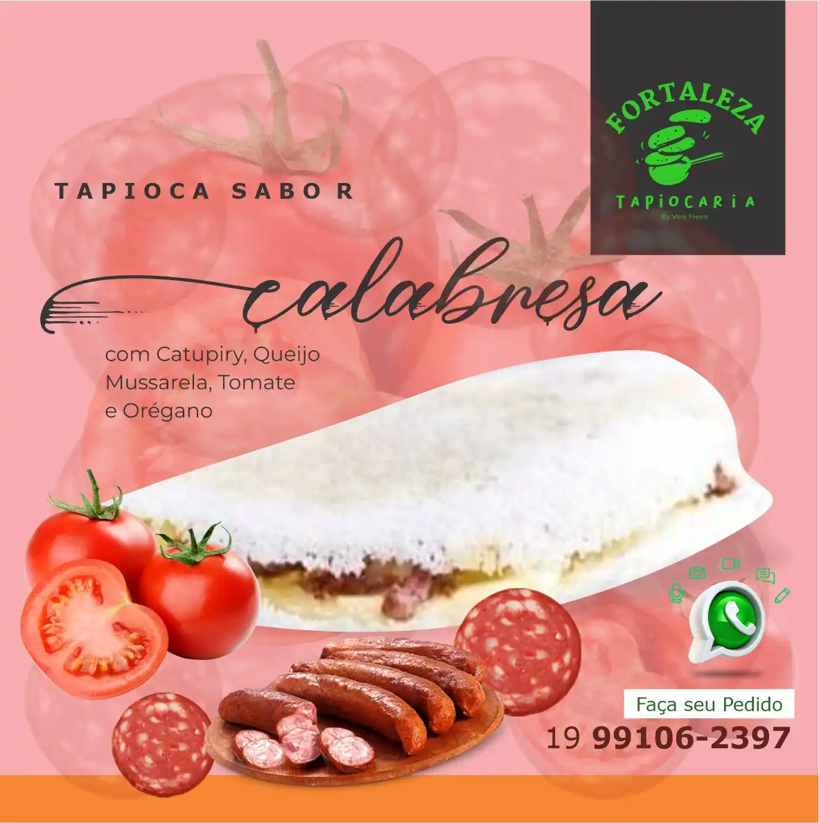 Propaganda de Tapioca de Calabresa com Cheddar e Tomate Tipo: Propaganda para Rede SocialSegmento: TapiocaCliente: Fortaleza TapiocariaCores: Rosa e LaranjaTexto na Publicidade: Tapioca sabor calabresa com catupiry, queijo mussarela, tomate e orégano