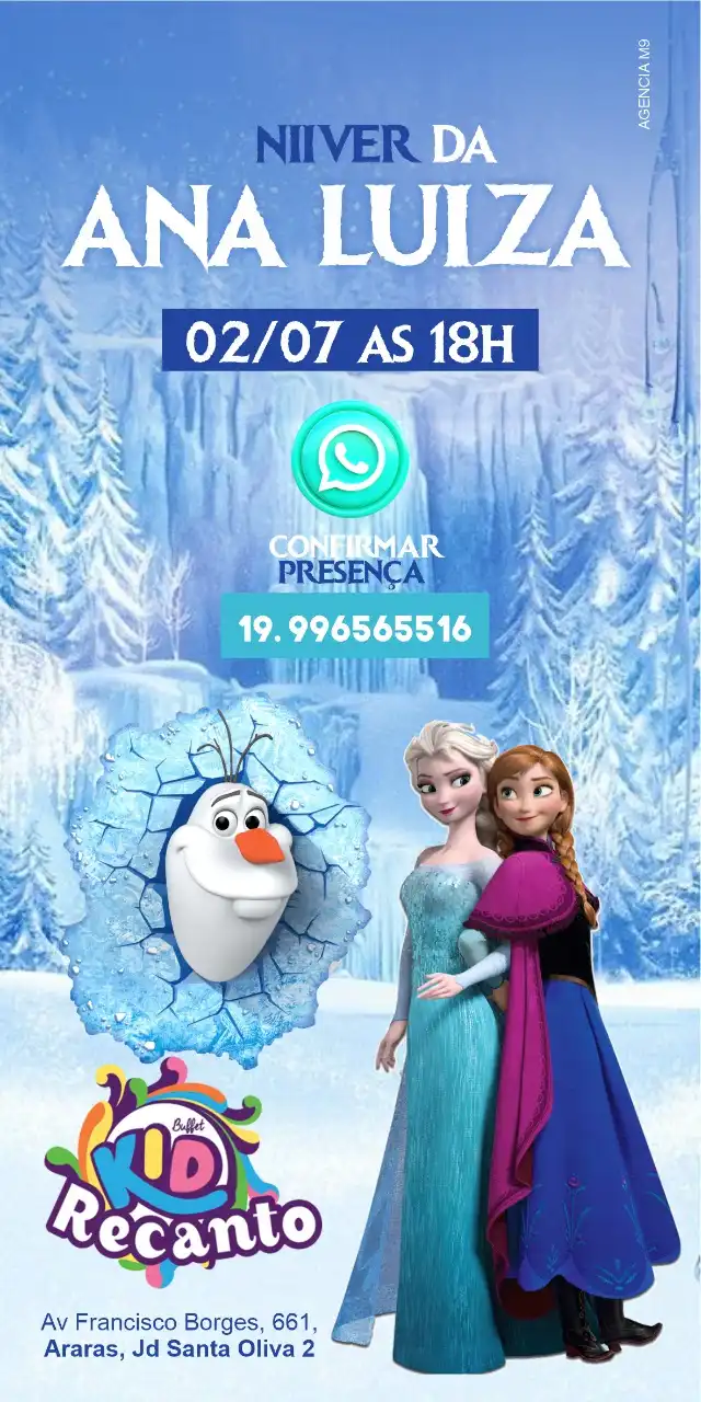 Convite Digital Tema Frozen Aniversário Tipo: Convite DigitalCliente: Buffet Kid RecantoTema: FrozenCores: Azul e brancoMensagem: Convite digital para festa de aniversário. Niver da Ana Luiza02/07 às 18 horas
