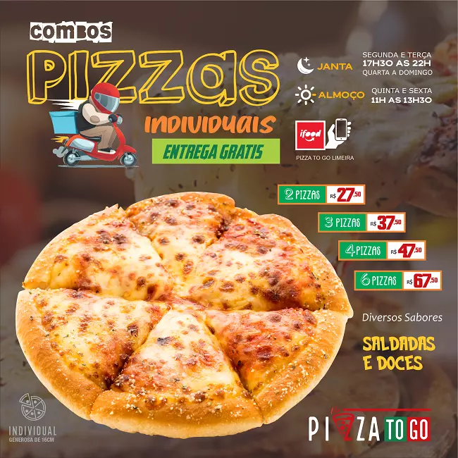 Propaganda Pizza Individual com Frete Grátis Ifood Tipo: Propaganda para Rede SocialFormato: FeedMídia: Instagram e FacebookSegmento: Pizza, Pizzaria, Pizzas, Pizza Individual, AlimentaçãoCores: Vermelho e VerdeCliente: Pizza to GoTema: Combo Ifood de Pizzas Individuais com entrega grátis. Diversos sabores de Pizzas Individuais
