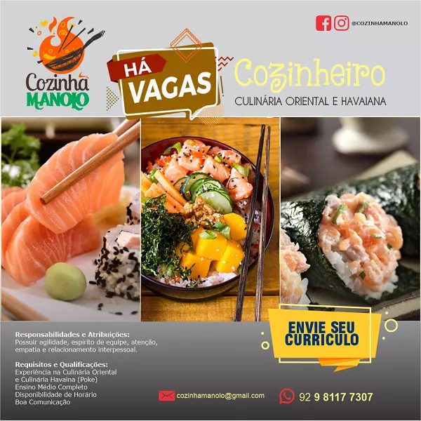 Propaganda de Vaga para Cozinheiro Tipo: Propaganda para Rede SocialSegmento: Cozinheiro, Cozinha, Alimentação, Emprego, VagaCores: Laranja, Verde, Amarelo e CinzaCliente: Cozinha ManoloAplicação: Feed Instagram e Feed FacebookTema: Propaganda Vaga de Emprego para Cozinheiro Propaganda desenvolvida para captar entrevistas em vaga de emprego de restaurante de comida oriental e havaiana através da divulgação da oportunidade como … Ler mais Propaganda de Vaga para Cozinheiro