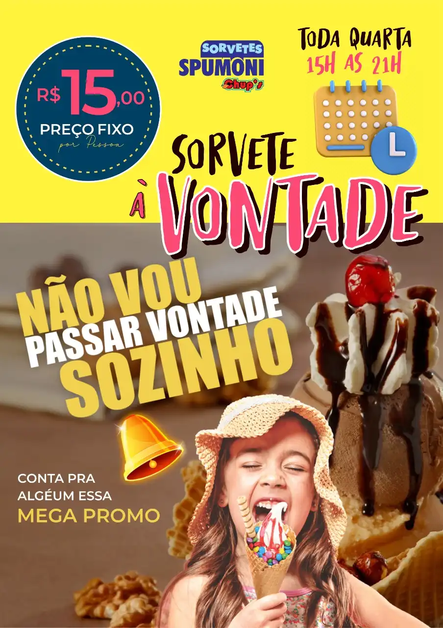 Cartaz Sorvete a Vontade por Preço Fixo para Sorveteria Tipo: CartazCliente: Sorvetes Spumoni ChupsTema: Sorvete à vontadeCores: Amarelo, azul e rosaMensagem: Cartaz para sorveteria Toda quartaDas 15h às 21 hSorvete à vontadeR$ 15,00 preço fixo por pessoaNão vou passar vontade sozinhoConta para alguém essa mega PROMO