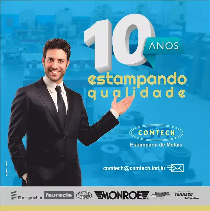Propaganda Estampos de Metais de Prensa Tipo: Propaganda para Rede SocialCliente: Comtech Estamparia de MetaisTema: Estampos de MetaisCores: Preto, azul e amareloMensagem: Propaganda para empresa de estamparia de metais. Estampos de metais.Setor automotivo.Estampando com qualidade.ISO 9001 e IATF 16949 www.comtech.ind.br