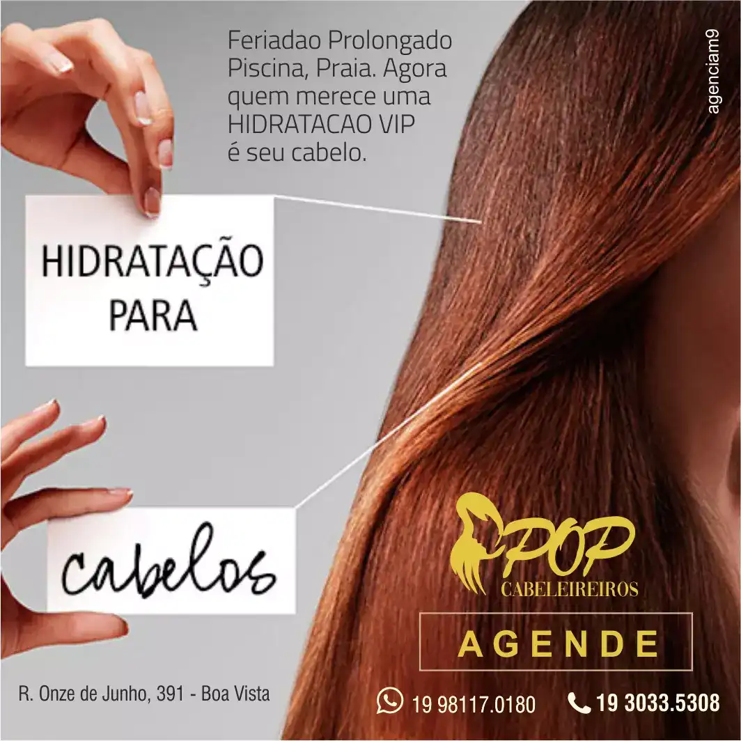 Propaganda sobre Hidratação de Cabelos Tipo: Propaganda para Salão de Beleza Segemento: Estética Cliente: Pop Cabelereiros Cidade: Limeira Chamada: Hidratação para Cabelos Feriado Prolongado: Piscina, praia; agora, quem merece uma hidratação vip é seu cabelo.