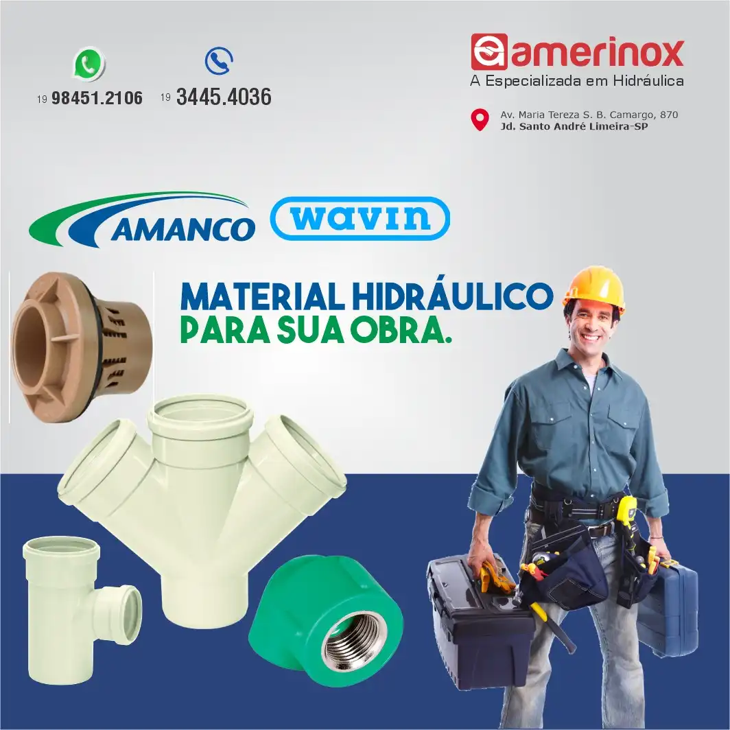 Propaganda Post Material Hidráulico Obra Construção Tipo: Propaganda para Rede SocialCliente: AmerinoxTema: Material HidráulicoCores: Azul, verde e vermelhoMensagem: Propaganda, para loja especializada em hidráulica, com as melhores marcas para sua obra, como Amanco e Wavin, WhatsApp: 98451-2106 ou pelo telefone: 3445-4036