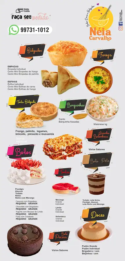 Cardápio para Confeitaria de Doces e Salgados Tipo: Cardápio, Folheto Segmento: Confeitaria, Alimentação, Salgados, Doces Cliente: Neia Carvalho Doces e Salgados Cores: Clean Imagens: Recortadas Formato: Vertical
