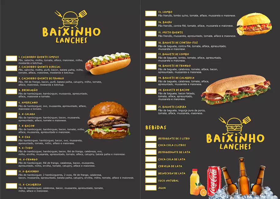 Cardápio Lanches e Bebidas Tipo: CardápioSegmento: Lanchonete, Lanches, AlimentaçãoCliente: Baixinho LanchesCores: Fundo preto, letras brancas e amarelasFormato: A3 frente e versoEstilo: ScktechConteúdo: Lanches em pão de cachorro quente, Lanches em pão de hambúrguer, lanches em pão francês, lanches em pão de baguete