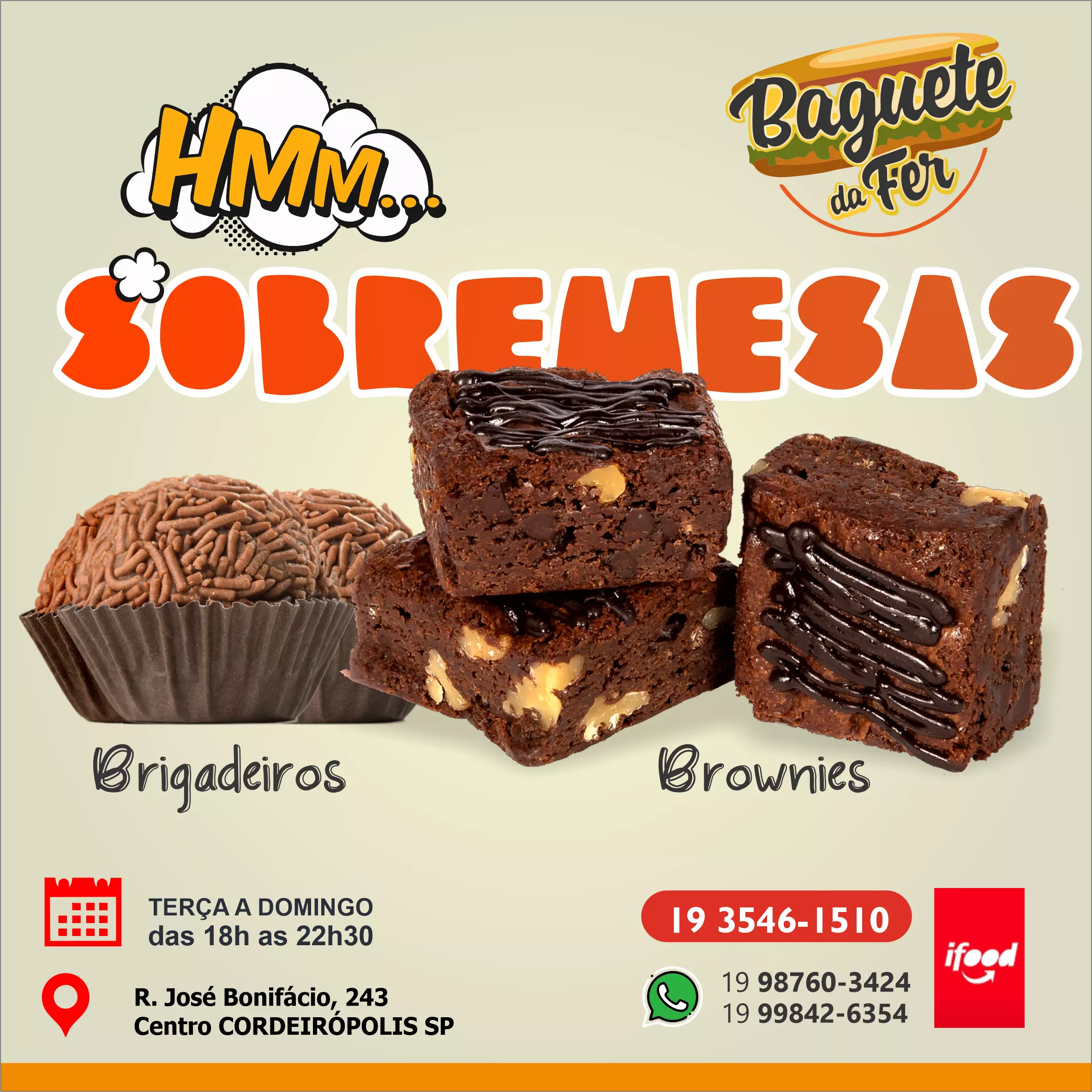 Propaganda sobremesas Brigadeiro e Brownies em Lanchonete Tipo: Propaganda para Rede SocialFormato: Feed para Instagram e FacebookSegmento: Alimentação, Bagueteria, LanchoneteClientes: Baguete da FerCores: Amarelo e LaranjaTema: Sobremesas Brigadeiros e Brownies em Lanchonete