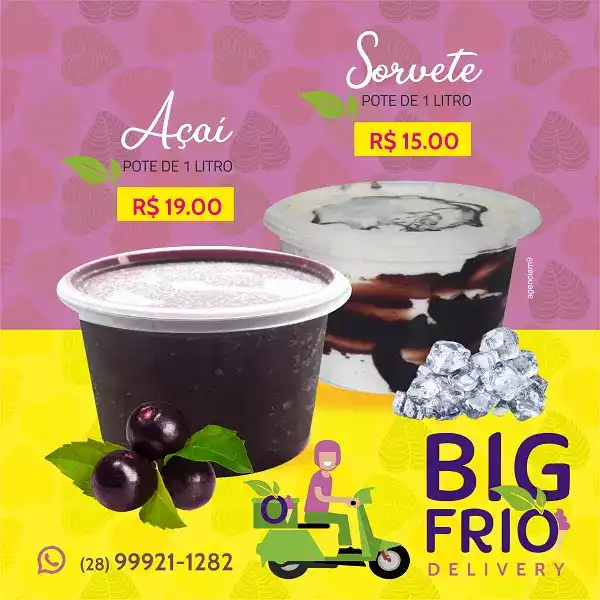 Propaganda de Açaí e Sorvete Tipo: Propaganda para InstagramSegmento: AlimentaçãoTema: Sorvete e AçaíCores: Vinho, Amarelo e Verde MaçãCliente: Big Frio DeliveryCidade: IrupiEstado: Espírito Santo Mensagem: Experimente o Açaí de um Litro ou o Sorvete de um Litro e venha se apaixonar pelo sabor.