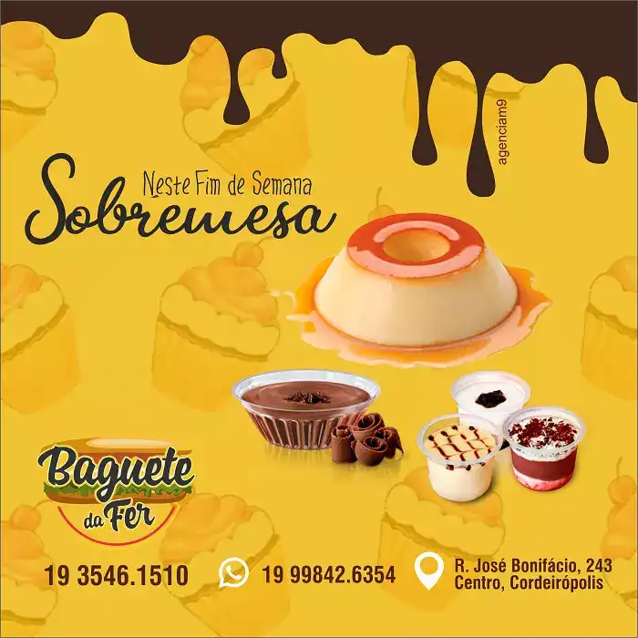 Propaganda de Sobremesa Tipo: Propaganda de Instagram para LanchoneteSegmento: SobremesaTema: Fim de Semana com SobremesasCores: Marrom, CarameloCliente: Lanchonete e Bagueteria da FerCidade: CordeirópolisEstado: São Paulo Mensagem: Venha neste final de semana saborear nossas deliciosas sobremesas
