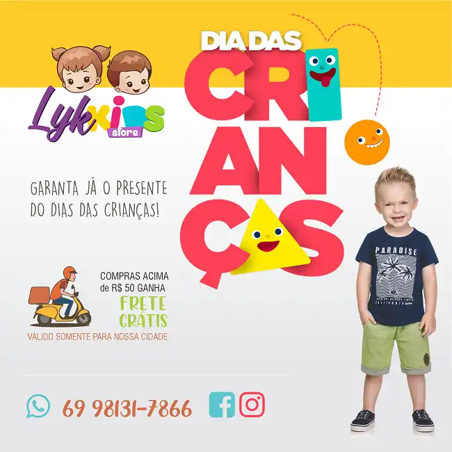 Propaganda Presente para Crianças Tipo: Propaganda para Rede Social Segmento: Moda Infantil Cores: Amarelo e Laranja Cliente: Luck Kids moda infantil Mensagem: Garanta já o presente do seu filho.