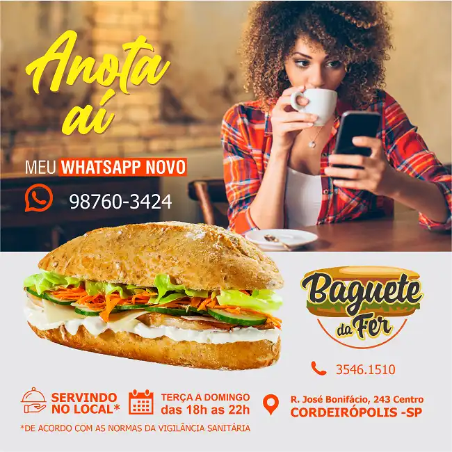 Propaganda Post Horário de Funcionamento Lanchonete Tipo: Propaganda para Rede SocialCliente: Baguete da FerTema: Horário de funcionamentoCores: Amarelo, vermelho e laranjaMensagem: Horário de funcionamento Noite: Terça a Domingo 18h as 22h30Almoço: Segunda a Sexta 10h as 14 h R. José Bonifácio, 243Centro, Cordeiropolis/SP