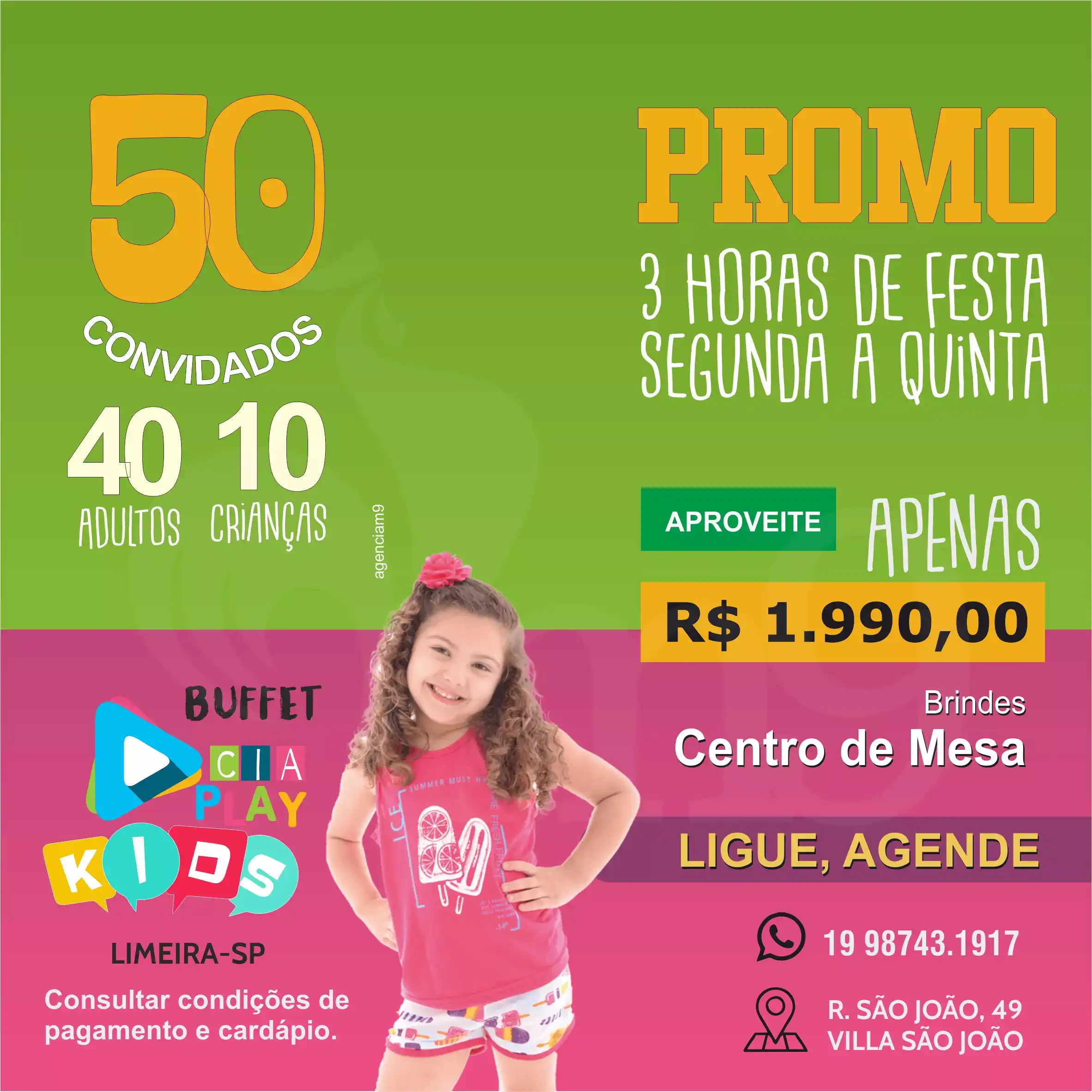 Propaganda Combo Festa Infantil Meninas Buffet Infantil Tipo: Propaganda para InstagramSegmento: AlimentaçãoTema: Combo Festa Infantil Meninas Buffet InfantilCliente: Buffet Cia Play KidsCores: Verde, amarelo e rosa.Mensagem: 50 convidados; 40 adultos e 10 crianças. Promoção de 3 horas de festa de segunda a quinta. Aproveite por apenas R$ 1.990,00. Brindes; Centro de mesa. Ligue, agende.