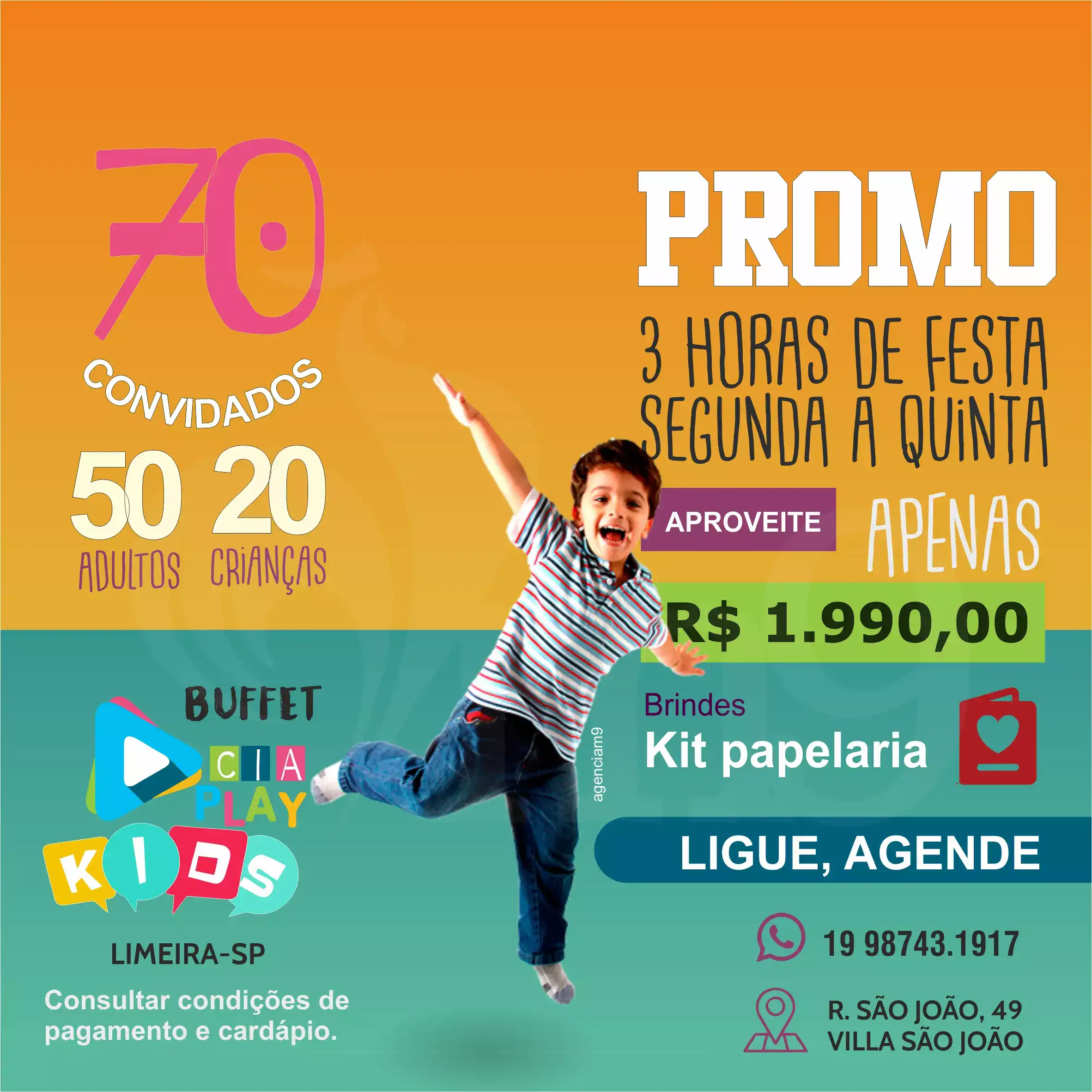 Propaganda Combo Festa Infantil Meninos Buffet Infantil Tipo: Propaganda para InstagramSegmento: AlimentaçãoTema: Combo Festa Infantil Meninas Buffet InfantilCliente: Buffet Cia Play KidsCores: Verde, laranja e rosa.Mensagem: 70 convidados; 50 adultos e 20 crianças. Promoção de 3 horas de festa de segunda a quinta. Aproveite por apenas R$ 1.990,00. Brindes; Kit papelaria. Ligue, agende.