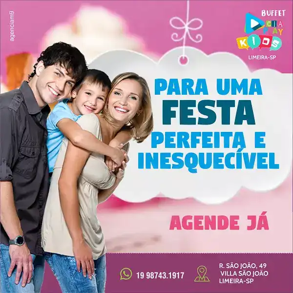 Propaganda Festa Buffet Familiar Tipo: Propaganda para InstagramSegmento: AlimentaçãoTema: Festa Buffet FamiliarCliente: Buffet Cia Play KidsCidade: LimeiraEstado: São PauloCores: Rosa e Azul Mensagem: Para uma Festa Perfeita e Inesquecível Buffet Familiar Cia Play Kids