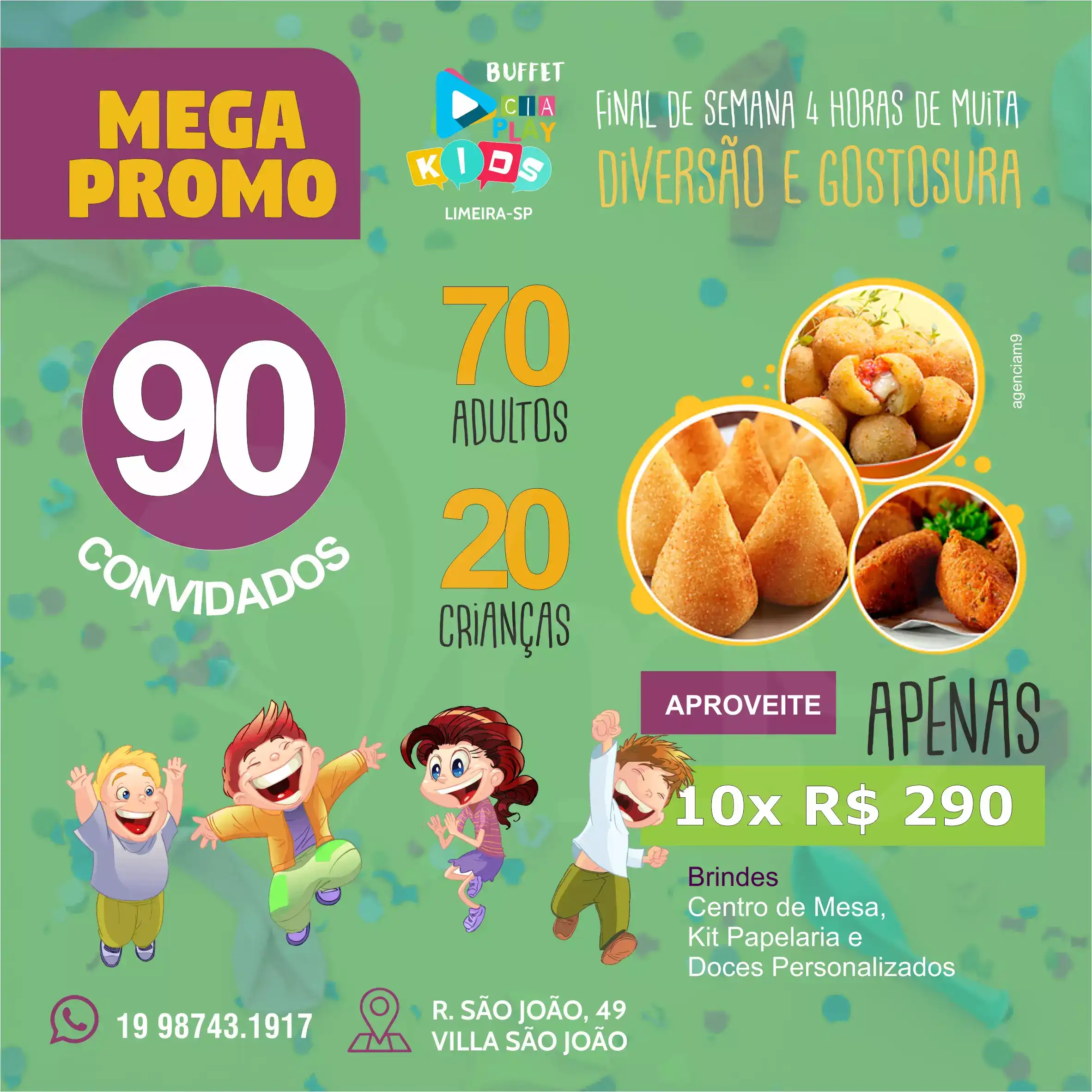 Propaganda Pacote de Festa Infantil em Buffet Tipo: Propaganda para InstagramSegmento: AlimentaçãoTema: Pacote de Festa Infantil em BuffetCliente: Buffet Cia Play kidsCores: Amarelo, verde e roxoMensagem: Mega promo 90 convidados 70 adultos e 20 crianças. Final de semana 4 horas de muita diversão e gostosura!Aproveite por apenas 10x de 290. Brindes; centro de mesa, kit papelaria e doces personalizados.