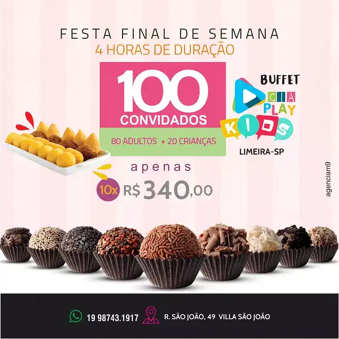 Propaganda Promoção Buffet Infantil Completa Tipo: Propaganda para InstagramSegmento: AlimentaçãoTema: Promoção Buffet InfantilCores: Rosa, Verde e Caramelo em tons pastelCliente: Buffet Infantil Cia Play KidsCidade: LimeiraEstado: São Paulo Mensagem: Festa de Final de Semana com quatro horas de duração para cem convidados oitenta adultos e vinte crianas. Aproveite.