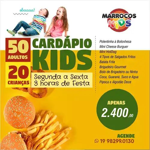 Propaganda para Cardápio Pacote Buffet de Festa Infantil Tipo: Propaganda para Instagram Segmento: Alimentação Cliente: Buffet Marrocos Kids Cidade: Limeira