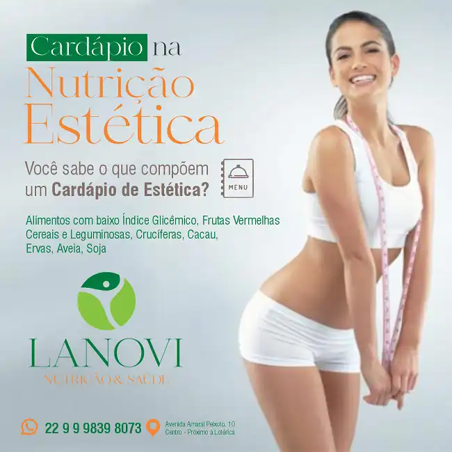 Mensagem: Cardápio na Nutrição Estética. Você sabe o que compõem um Cardápio Estético? Alimentos com baixo Ãndice glicêmico, frutas vermelhas, cereais e leguminosas, crucÃferas, cacau, ervas, aveia e soja.