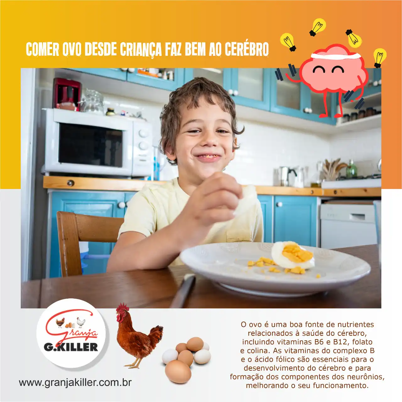 Layout Propaganda Comer Ovos desde criança faz bem para o cérebro Granja de Ovos Caipira de Galinhas Livres.
