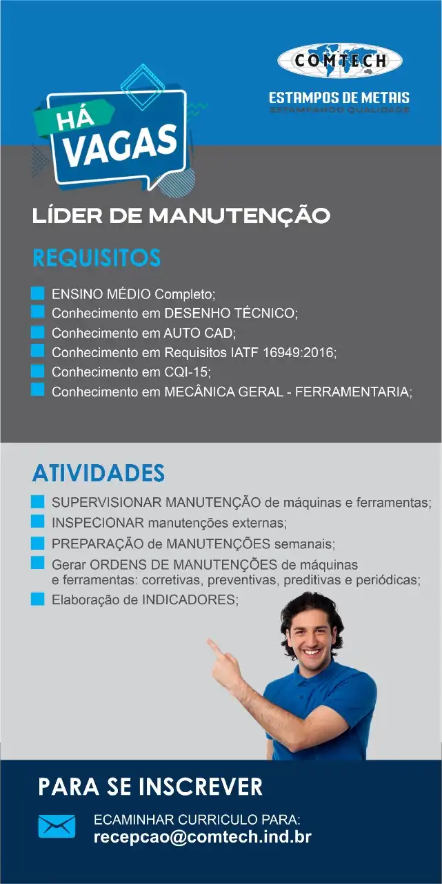 Cartaz vaga de Emprego em Indústria Tipo: CartazCliente: Comtech Estampos de MetaisTema: Vaga de empregoCores: Azul, branco e cinzaMensagem: Cartaz com anúncio de vaga de emprego. Há vagas:LÃder de manutenção.Requisitos:Ensino médio completo; Conhecimento em desenho técnico; Conhecimento em Auto-Cad; Conhecimento em requisitos IATF 16949:2016; Conhecimento em CQI-15; Conhecimento em mecânica geral-ferramentaria;Atividades:Supervisionar manutenção de máquinas e … Ler mais Cartaz vaga de Emprego em Indústria