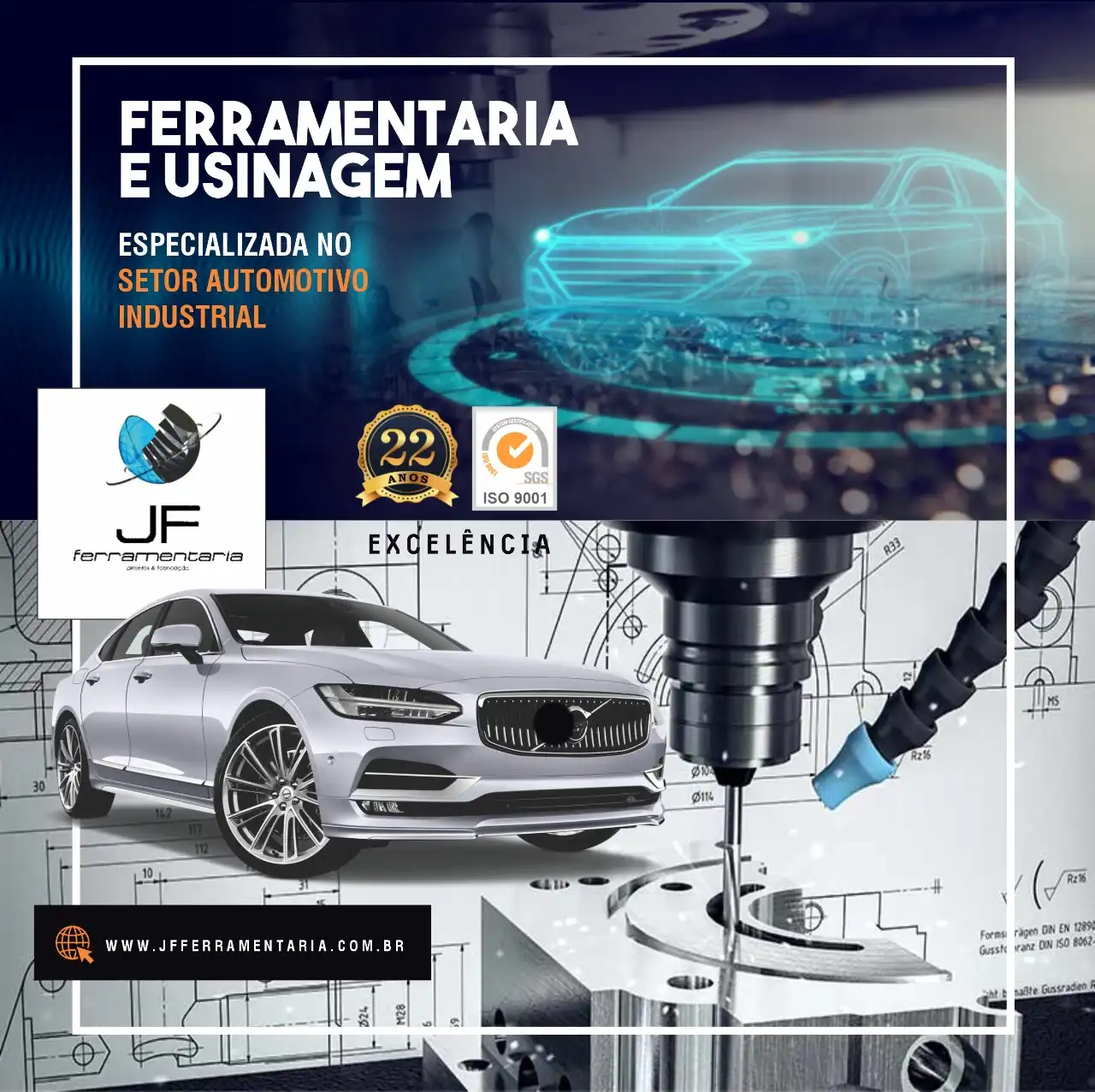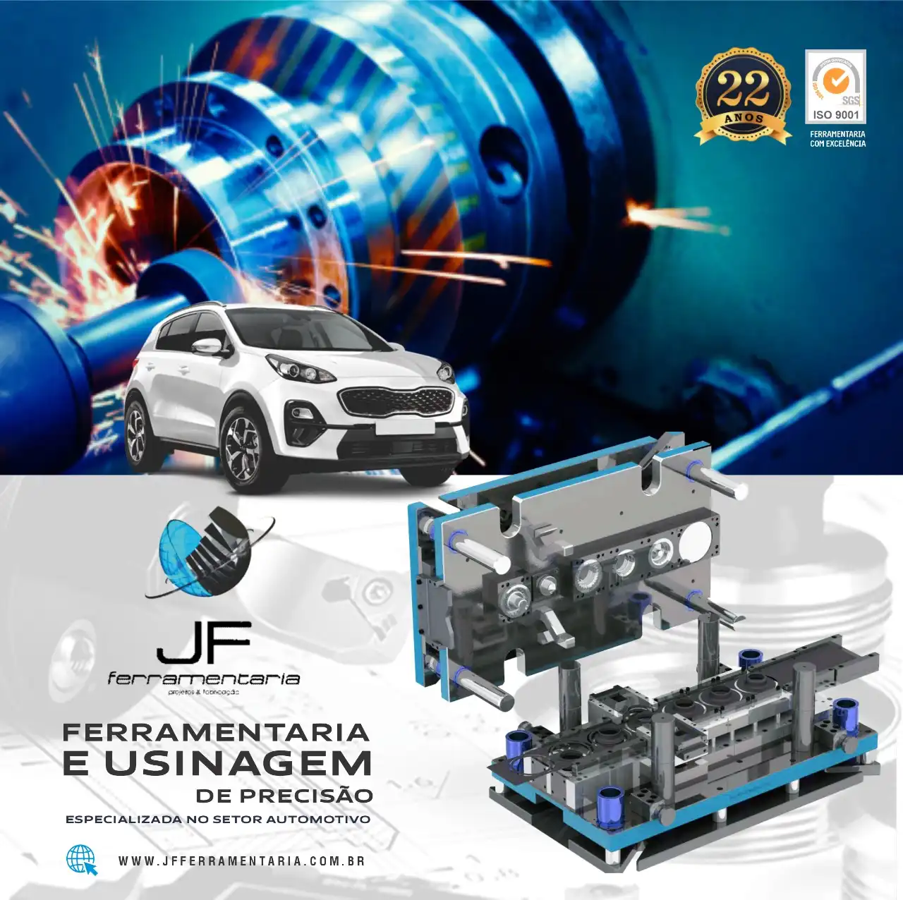 Propaganda Usinagem CNC Setor Automotivo Industrial Tipo: Propaganda para Rede SocialCliente: JF FerramentariaTema: Usinagem CNCCores: Azul, branco e cinzaMensagem: Propaganda para JF Ferramentaria, com serviços de ferramentaria e usinagem de precisão, especializada no setor automotivo, com 22 anos de experiência. Acesse www.jf.ferramentaria.com.br