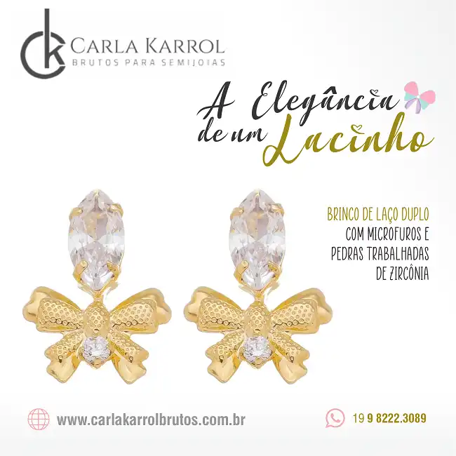 Propaganda Brinco de Lacinho para Semijoia Tipo: Propaganda para Rede Social Segmento: Semijoia, Brutos, Joias, Folheados Tema: Brinco de Lacinho para Semijoia Cores: Dourado, Preto e Rosa Cliente: Carka Karrol Brutos para Semijoais Mensagem: Brinco de laço duplo com micro furos e pedras trabalhadas de zircônia. Saiba mais www.carlakarrolbrutos.com.br