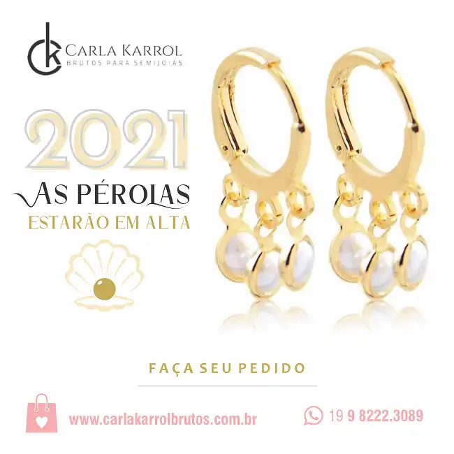 Propaganda Brincos de Pérolas tendência 2021 Tipo: Propaganda para Rede Social Segmento: Semijoia, Joia, Joias, Brutos Cores: Branco e Dourado Tema: Brincos de Pérolas tendência 2021 Cliente: Carla Karrol Brutos 2021 as pérolas estão em alta. Veja a linha completa de Brutos para Semijoias: www.carlakarrolbrutos.com.br