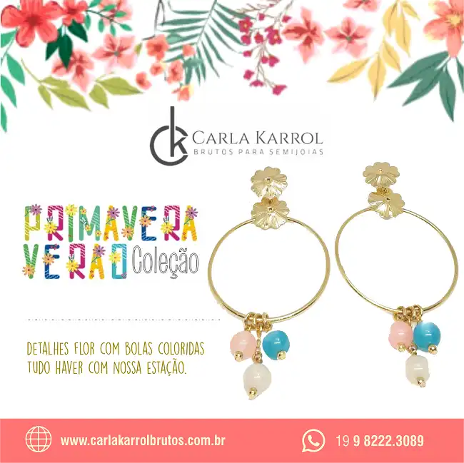 Propaganda Coleção Primavera Verão de Brutos para Semijoias Tipo: Propaganda Rede SocialSegmento: Brutos, SemijoiasTema: Coleção Primavera Verão de Brutos para SemijoiasCores: Rosa e Verde Mensagem: Coleção Primavera Verão. Joia em Brutos com detalhes de flor com bolas coloridas, tudo haver com a estação. Acesse: https://www.carlakarrolbrutos.com.br