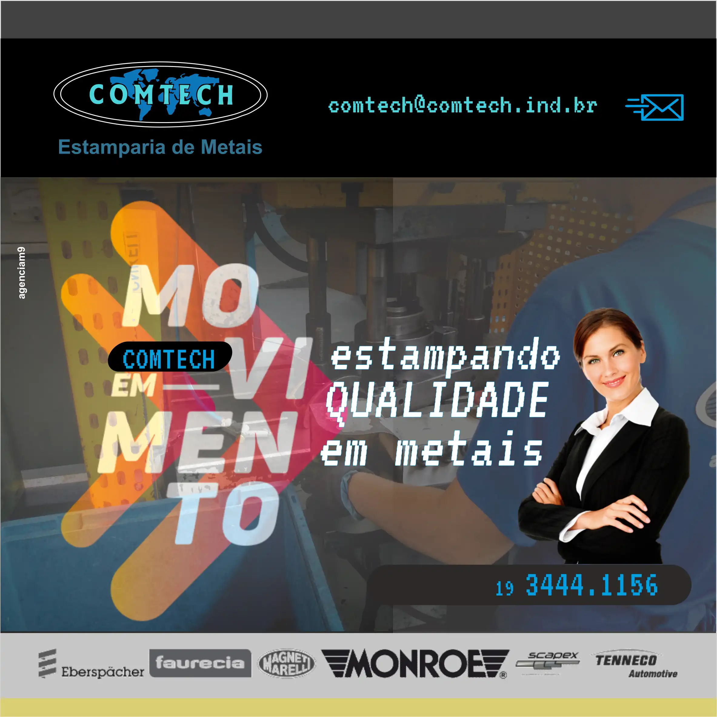 Propaganda Indústria de Estampos de Metais para Carros Tipo: Propaganda para Rede SocialCliente: Comtech Estampos de MetaisTema: Estampos de MetaisCores: Azul, preto e brancoMensagem: Propaganda, para indústria de estampos de metais no setor automotivo industrial; Estampando com qualidade; Contendo selo ISO 9001 e IATF 16949; Acesse o site: www.comtech.ind.br;