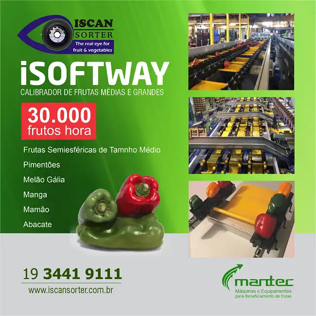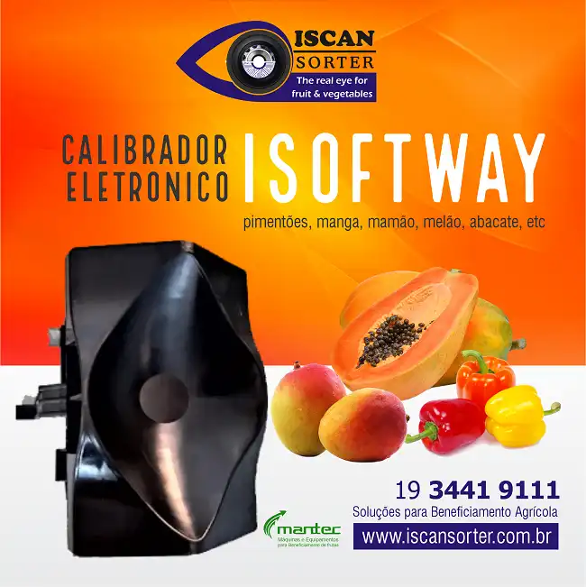 Propaganda Calibrador Eletrônico Pimentão, Manga, Mamão, Melão e Abacate Tipo: Propaganda para Rede SocialFormato: Feed para Linkedin, Instagram e FacebookSegmento: Beneficiamento Agrícola, Agrícola, Indústria, AutomaçãoTema: Calibrador Eletrônico Pimentão, Manga, Mamão, Melão e AbacateCores: Laranja e BrancoCliente: Iscan Sorter Soluções em Beneficiamento Agrícola Mensagem: Calibrador Eletrônico ISOFTWAY. Calibra produção de pimentões, manga, mamão, melão e abacate.