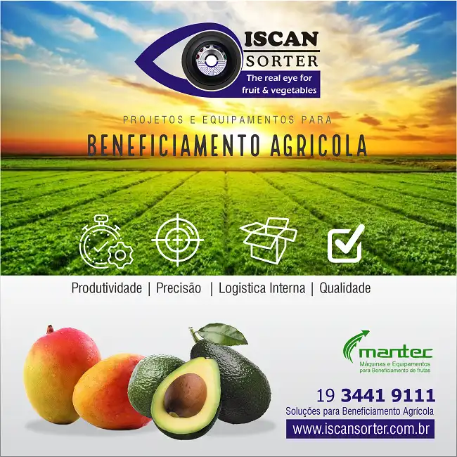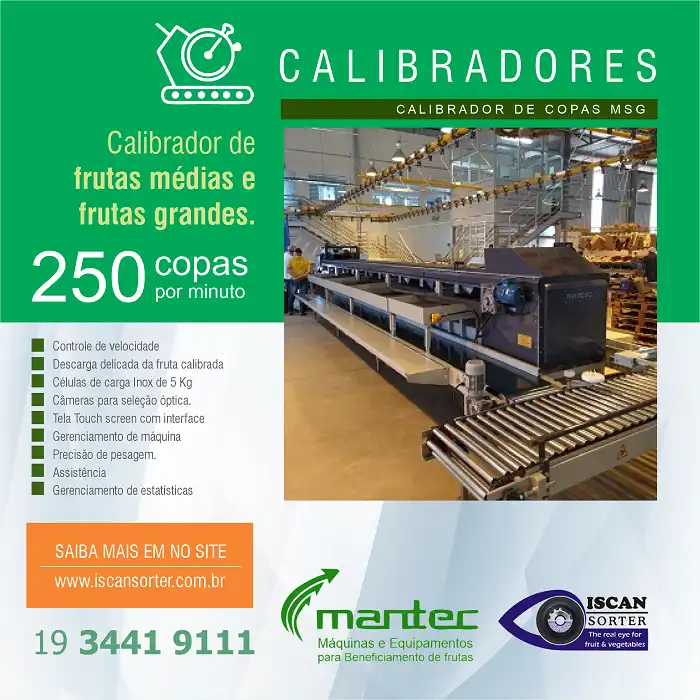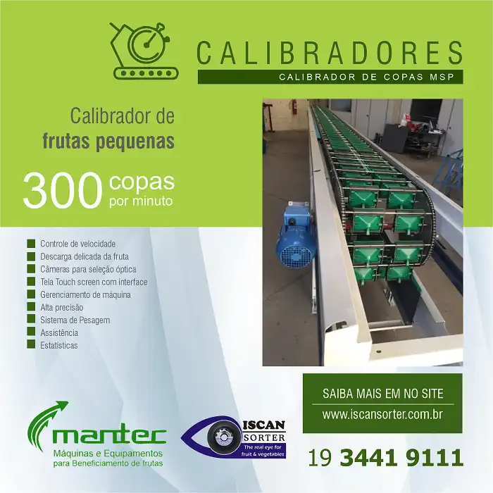 Propaganda Calibrador de Frutas Médias e Grandes Tipo: Propaganda para Rede Social Segmento: Agrícola Tema: Calibrador de Frutas Médias e Frutas Grandes Cores: Verde Claro, Verde Escuro, Laranja Mensagem: Calibrador de Frutas Médias e Grandes de Duzentos e Cinquenta Copas por minuto, controle de velocidade, descarga delicada da fruta calibrada, células de carga, câmeras para … Ler mais Propaganda Calibrador de Frutas Médias e Grandes