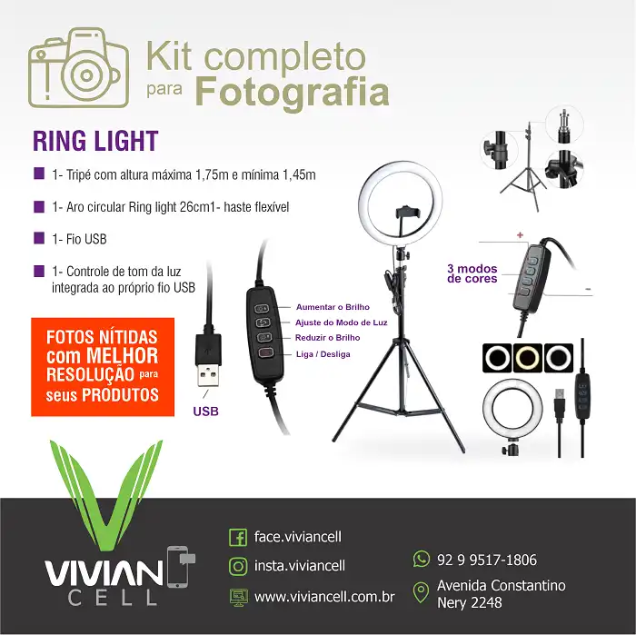 Mensagem: Kit completo para fotografia. Ring Ligth; Tripé de fotografia; Aro circular de fotografia; Fio USB para conexão; Controle de tom da Luz Integrada ao Próprio fio USB; Aumento da Luz; Ajuste do Modo de Luz; Redução do Brilho. Com o Equipamento de Fotografia você consegue tirar fotos mais nÃtidas com melhor resolução para seus produtos.