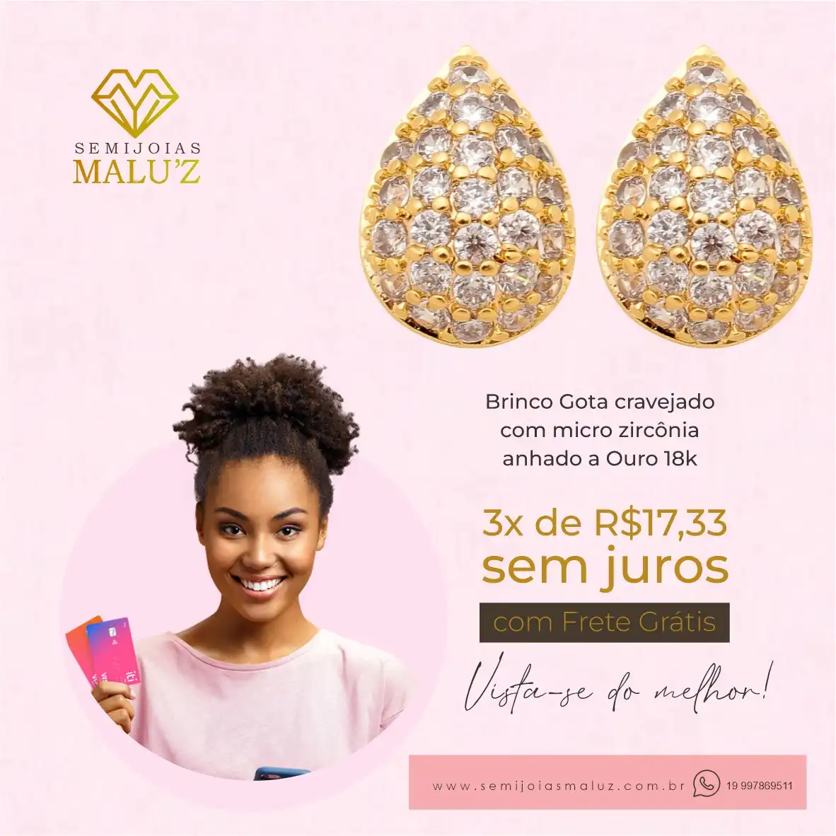 Propaganda Post Brinco Gota Ouro 18k Tipo: Propaganda para Rede SocialCliente: Semijóas Malu’zTema: Brinco gotaCores: Rosa, amarelo e marromMensagem: Brinco gota CravejadoCom microzircôniasBanhado a ouro 18 k